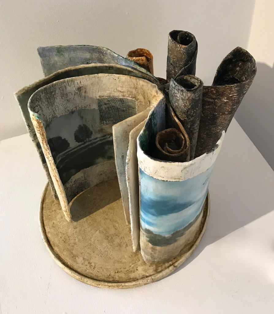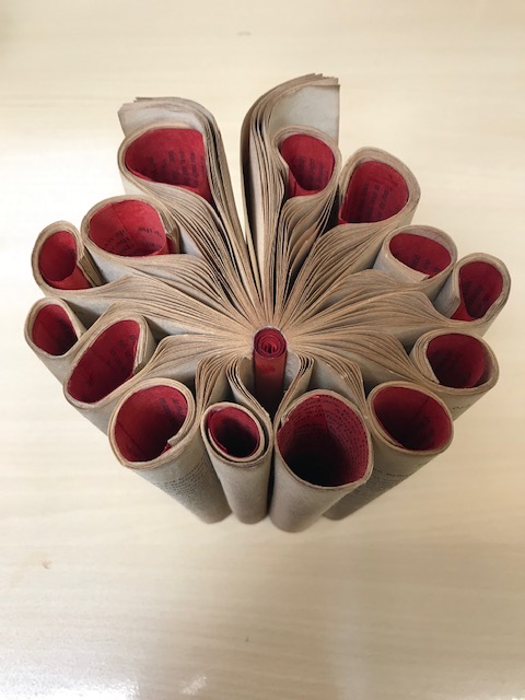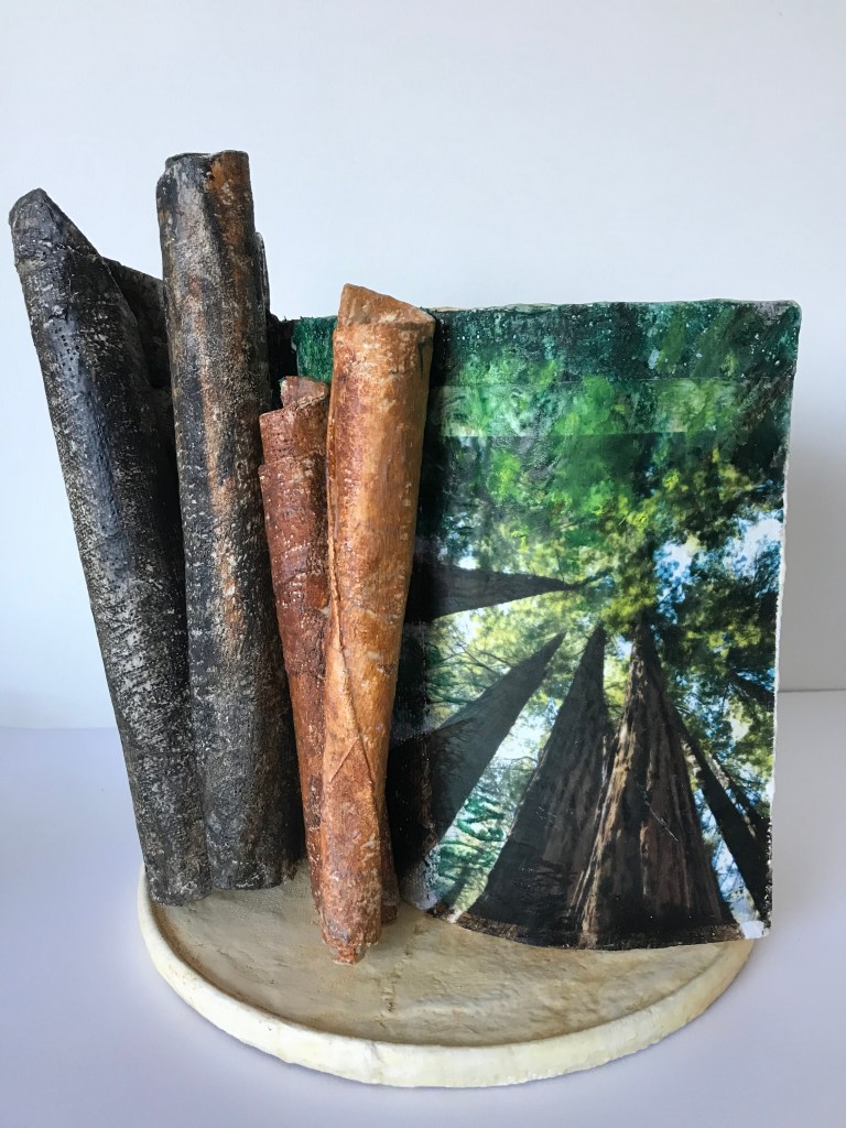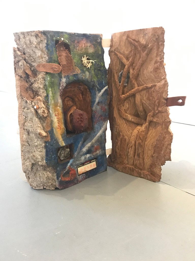 Books are a wonderful physical venue for art creation. For each project I try to choose a book that has a particular relationship to my theme. Over the years, I’ve created many altered books in response to grief and loss, travel, environment and family.