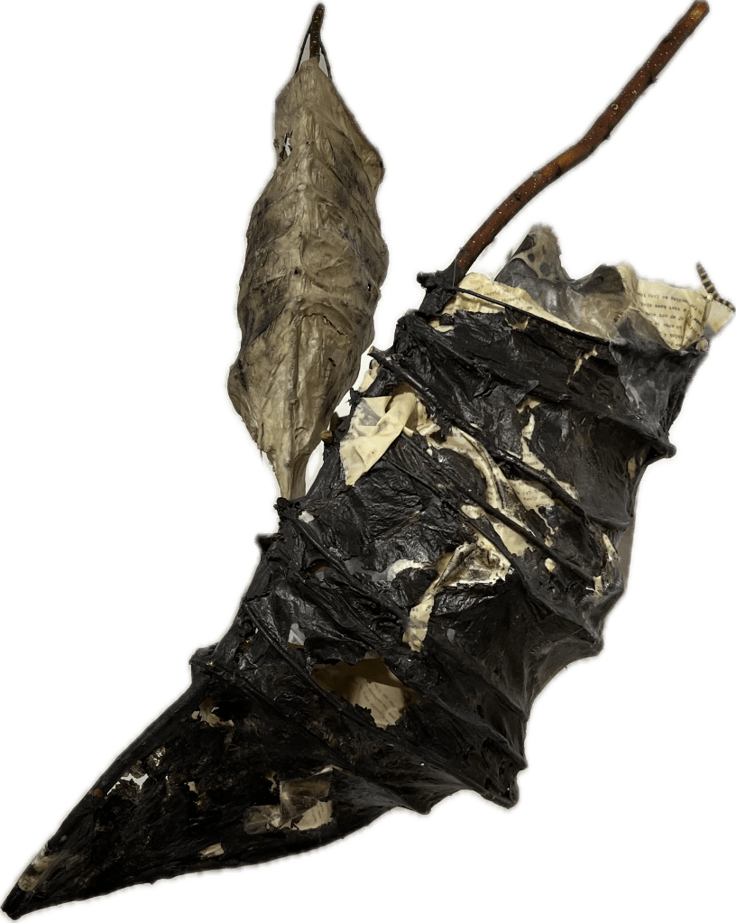 After my friend Richard died with AIDS, I created 2 ribcage pieces in handmade paper to honour his ravaged body. For a recent exhibition theme of ‘Palimpsest’, I reworked the original pieces by typing a letter to him on cotton bedsheets about AIDS, our friendship, and life on this planet since he died. Working this cloth into the darker ragged ribcage, some words are legible, others obscured. A beeswax coating softens my words and preserves the friendship. Text describing Richard’s identity on the smaller ribcage attempts to counteract the erasure that still accompanies AIDS, death, and the passage of time.