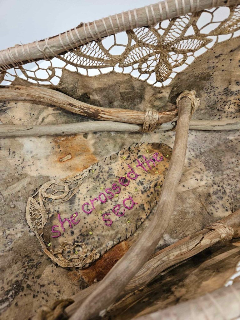 Driftwood, my grandmother’s linen table runner dyed with beach rust & beach wood, jute, marine thread.