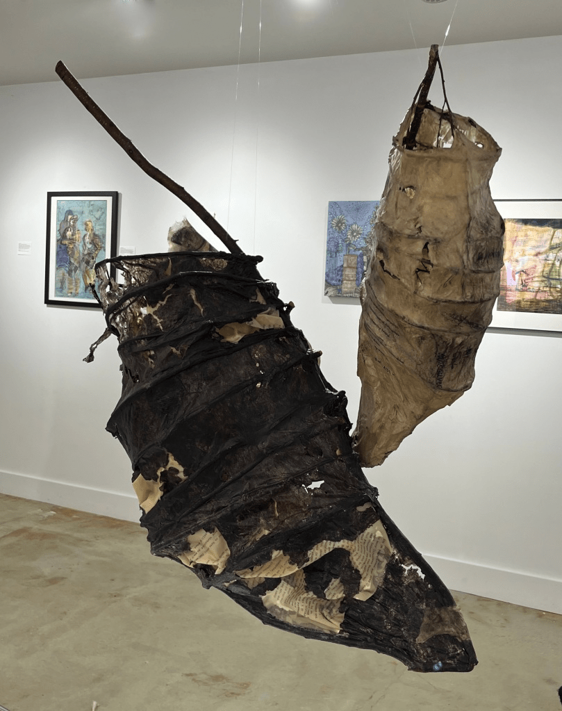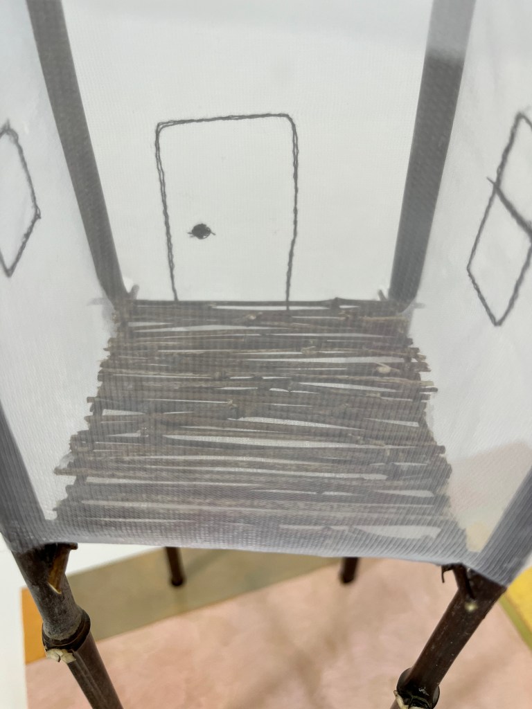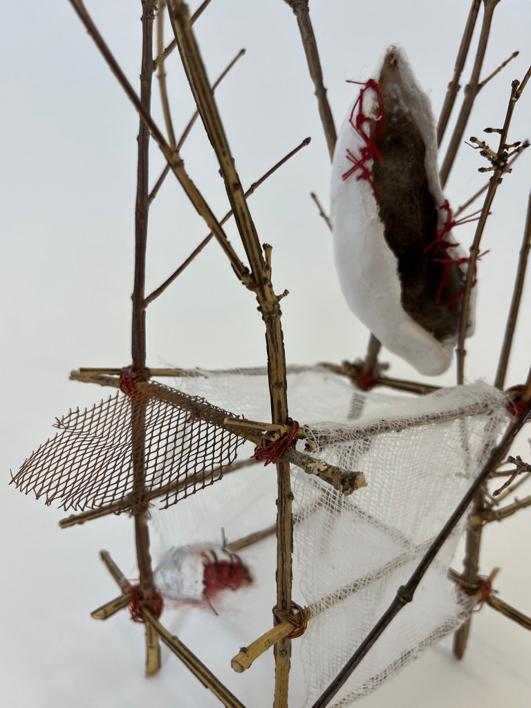 This piece was revisited for the exhibition “Thresholds” as a statement about the vulnerability of housing for folks in Victoria and beyond. Created from sticks, gauze, copper wire and screen, plaster gauze, fleece and thread.