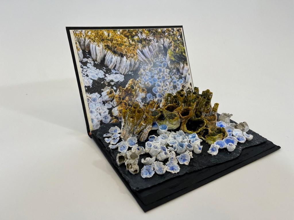 Incorporating my shoreline photo (taken on a sandbar reef at Yellow Point Lodge) as inspiration, I created this altered book (“A Lamp in the Darkness” by Jack Kornfield), as a statement about climate change. By shaping and painting wet plaster gauze, in combination with barnacles, my goal was to highlight the shoreline crisis.