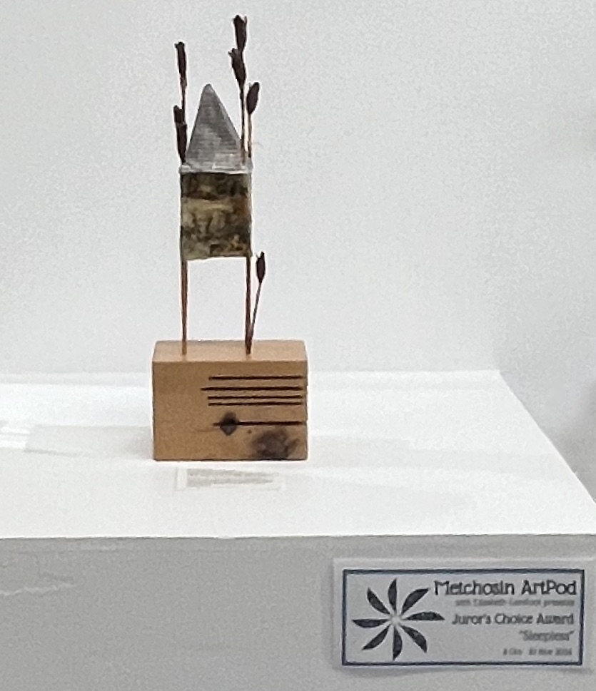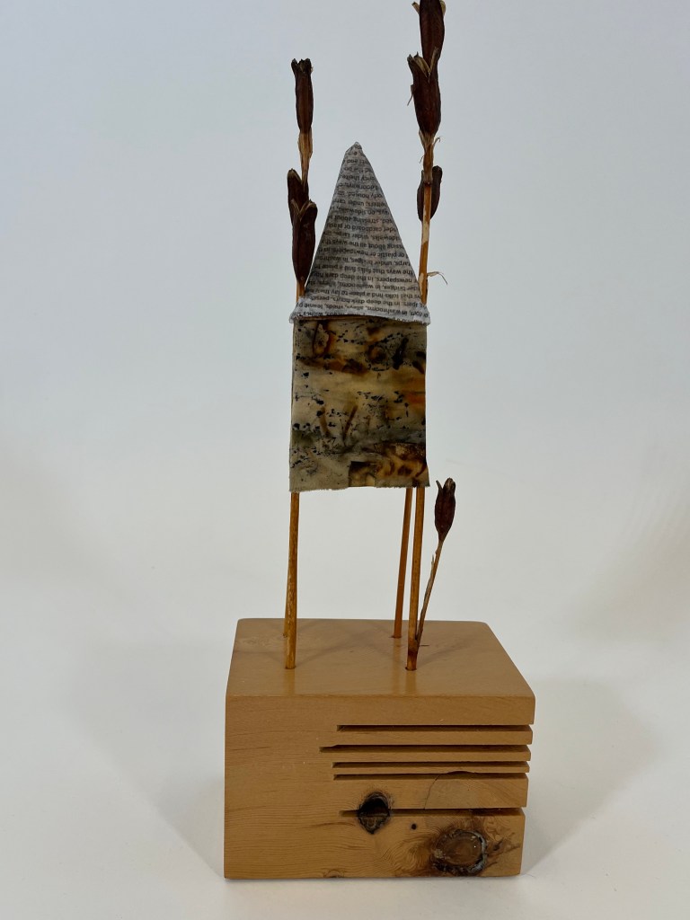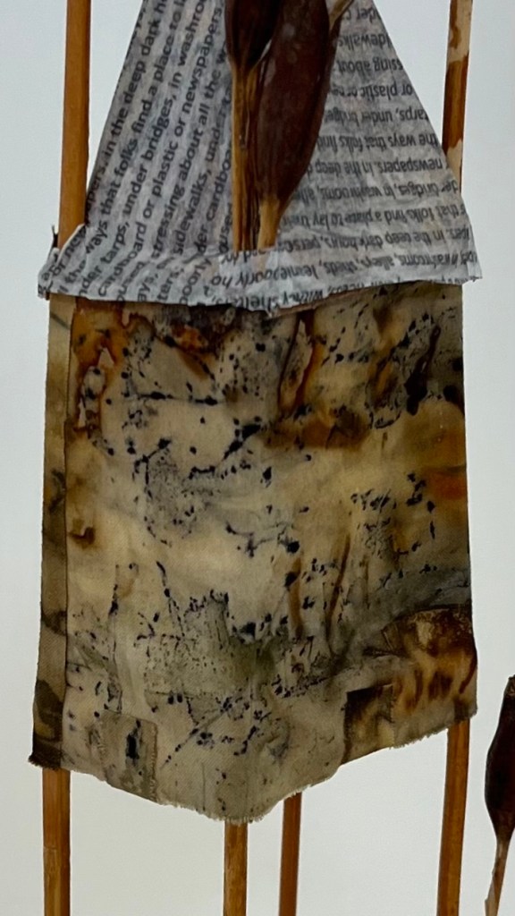 Rust printed cotton fabric is wrapped around iris seed pods, and mounted on Vancouver Island yellow cedar. Impressions about where the unhoused find places to sleep are typed on onionskin paper to form the roof.