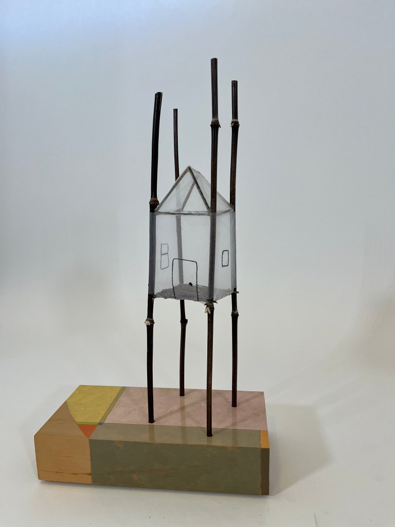 For the exhibition “Thresholds”, this piece was created in response to the housing crisis in Victoria and elsewhere. I made use of sheer fabric, stitching, and bamboo posts and flooring, on a base of Vancouver Island yellow cedar, painted by Peggy Bell.